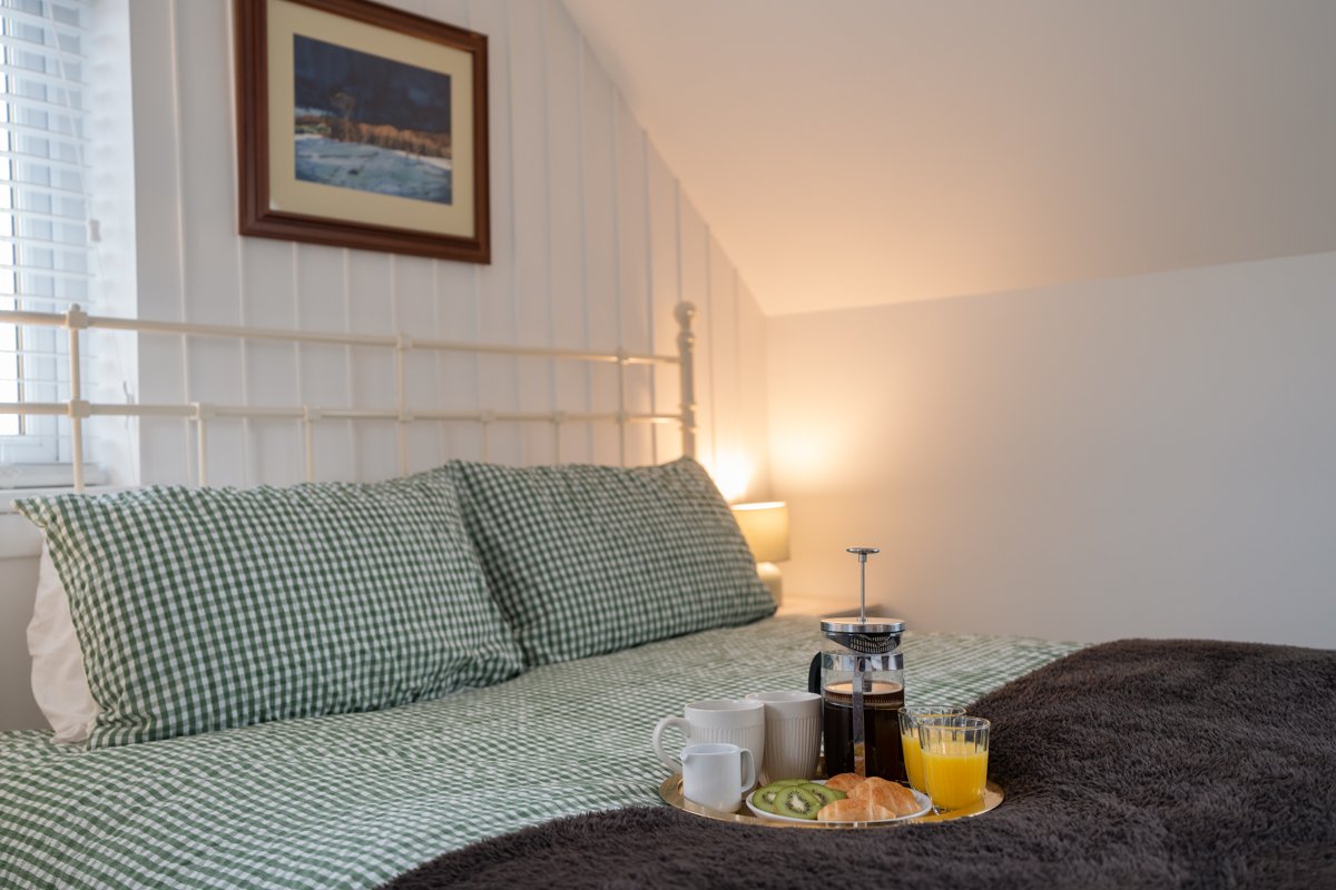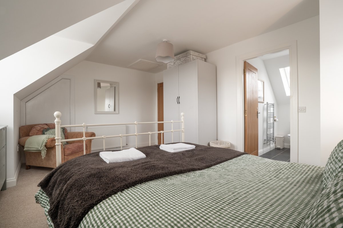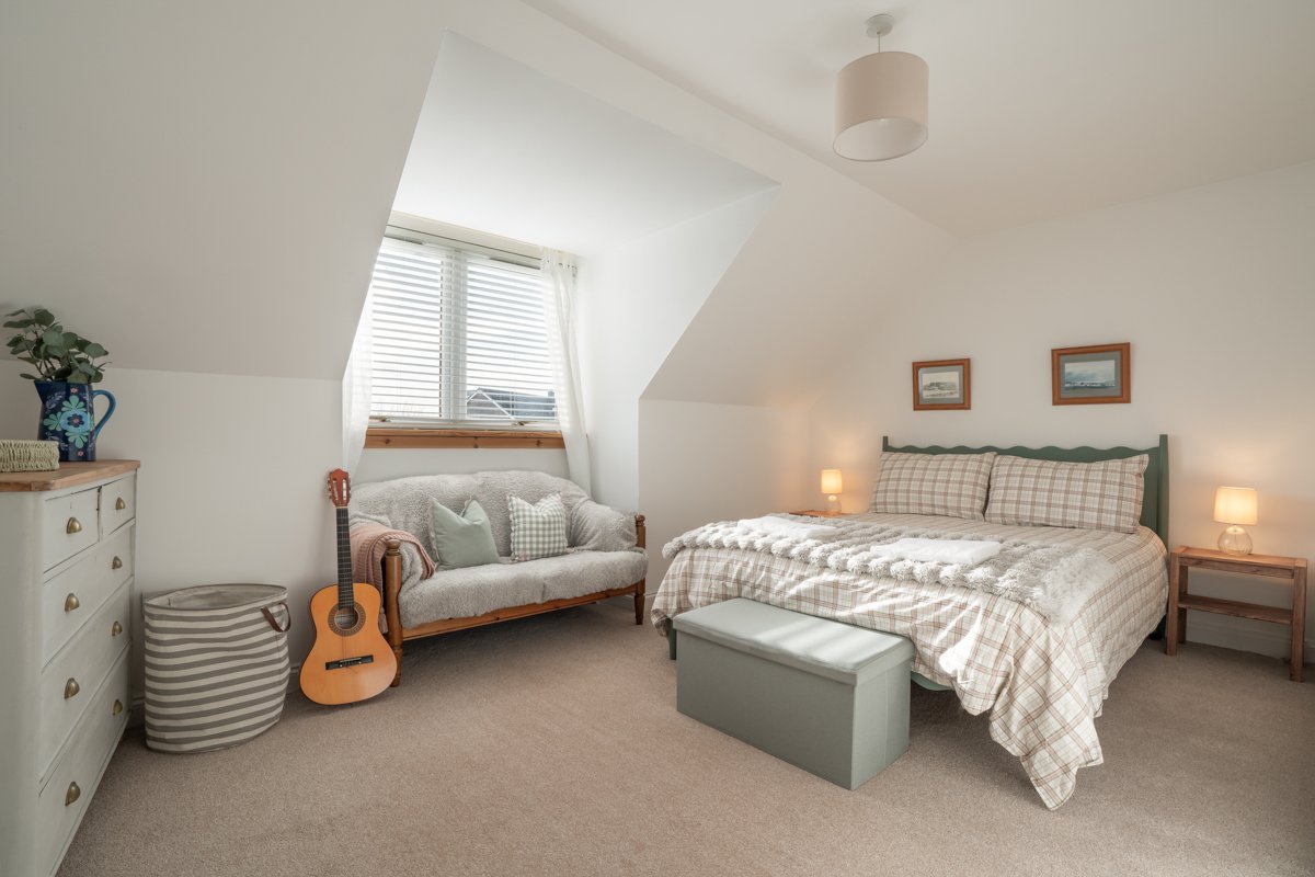 Venturing upstairs, Cill Bheag offers three roomy and beautifully appointed bedrooms, plus two further bathrooms. The king-sized master double is en-suite with a walk-in shower, WC and basin, oodles of storage space and comfy occasional chair too. Decorated in a tranquil palette, the space feels restorative and peaceful – a good night’s sleep is guaranteed here.