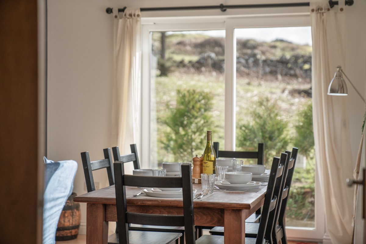 Arriving at Cill Bheag, you can unpack with ease from the paved driveway just beside the cottage with parking for two cars. The cottage is spacious from the outset, as the front door leads into a roomy entrance hall, with the kitchen and utility to the left and the spacious dining living room to the right.