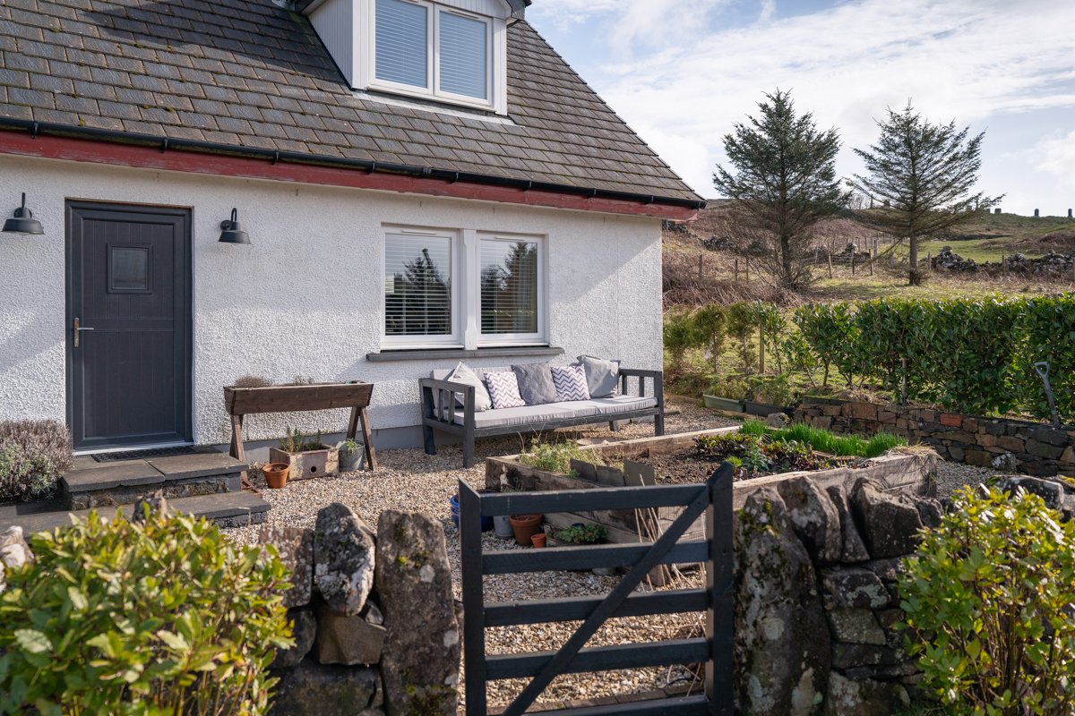 Surrounding the cottage, there’s a pretty gravel garden to the front with a bench and raised bed planters, framed by a low stone wall, and to the rear a nice paved patio with dining table and chairs. A lovely sun trap from which to catch the westerly sunset as the fading light turns the distant hills tones of amber, pink and red.