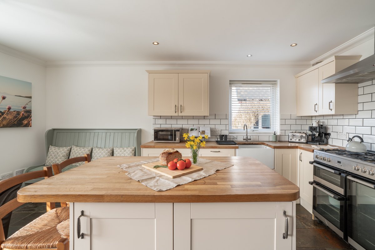 The kitchen is a sociable and light-filled space with central island and breakfast bar, a charming dresser and casual seating, so all the group can come together when whipping up meals or making morning coffee with the DeLonghi machine. Just off the kitchen is a spacious utility, with washing machine, dryer and a back door to the garden – ideal for tidying up muddy paws after a walk.