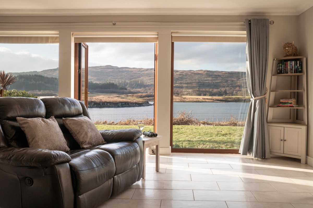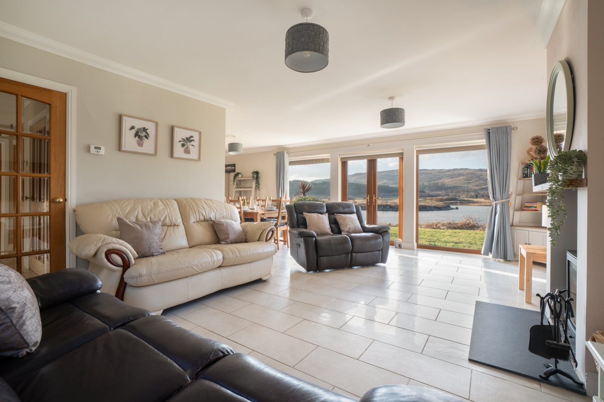 Living Room: Spacious living room area which leads through to dining and kitchen (open plan). Large windows with wonderful views of the loch. Comfortable seating, local artwork and television with full sky package. CD player and radio.