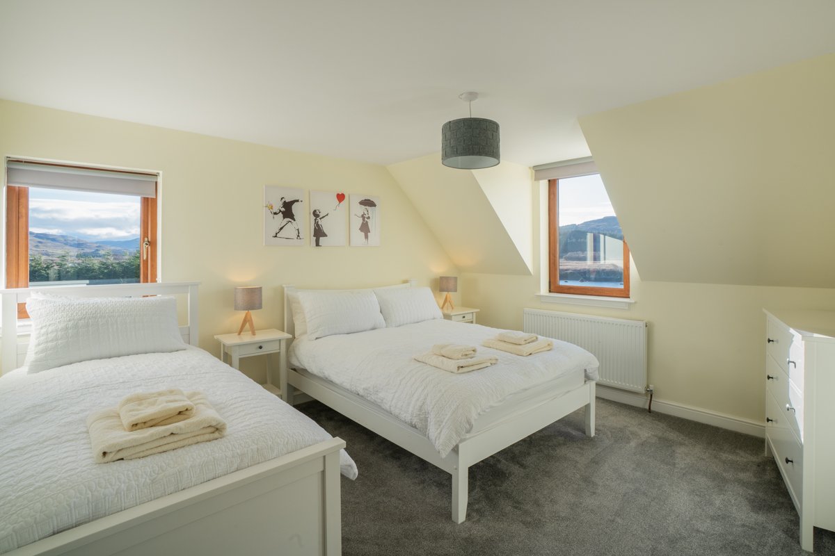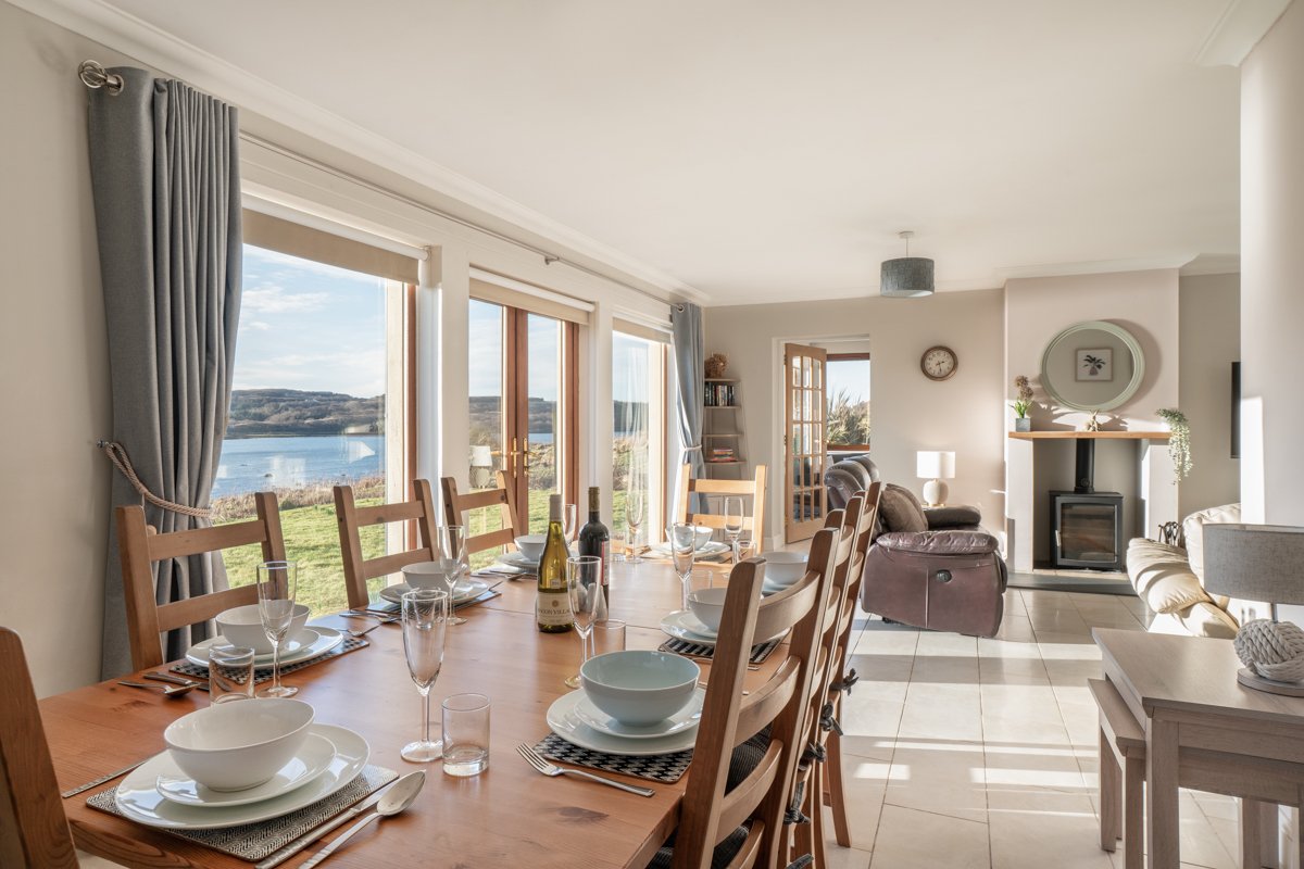There is ample parking for several cars at Torr a Mhannich and entering the property, the spacious hallway leads to the downstairs living areas. The main living area is open plan with the kitchen, dining area and sitting room all occupying a large L-shaped space with fantastic views over Loch Cuin. There are plenty of comfortable seats and sofas, television with Sky channels, books and local artwork. Enjoy a cup of coffee overlooking the loch and watch for wildlife in the mornings, or curl up on the sofa in the evenings with the wood burning stove alight. There is also a W.C. on the ground floor and a separate utility room with a washing machine and dryer – they could come in handy after a day of island adventures!