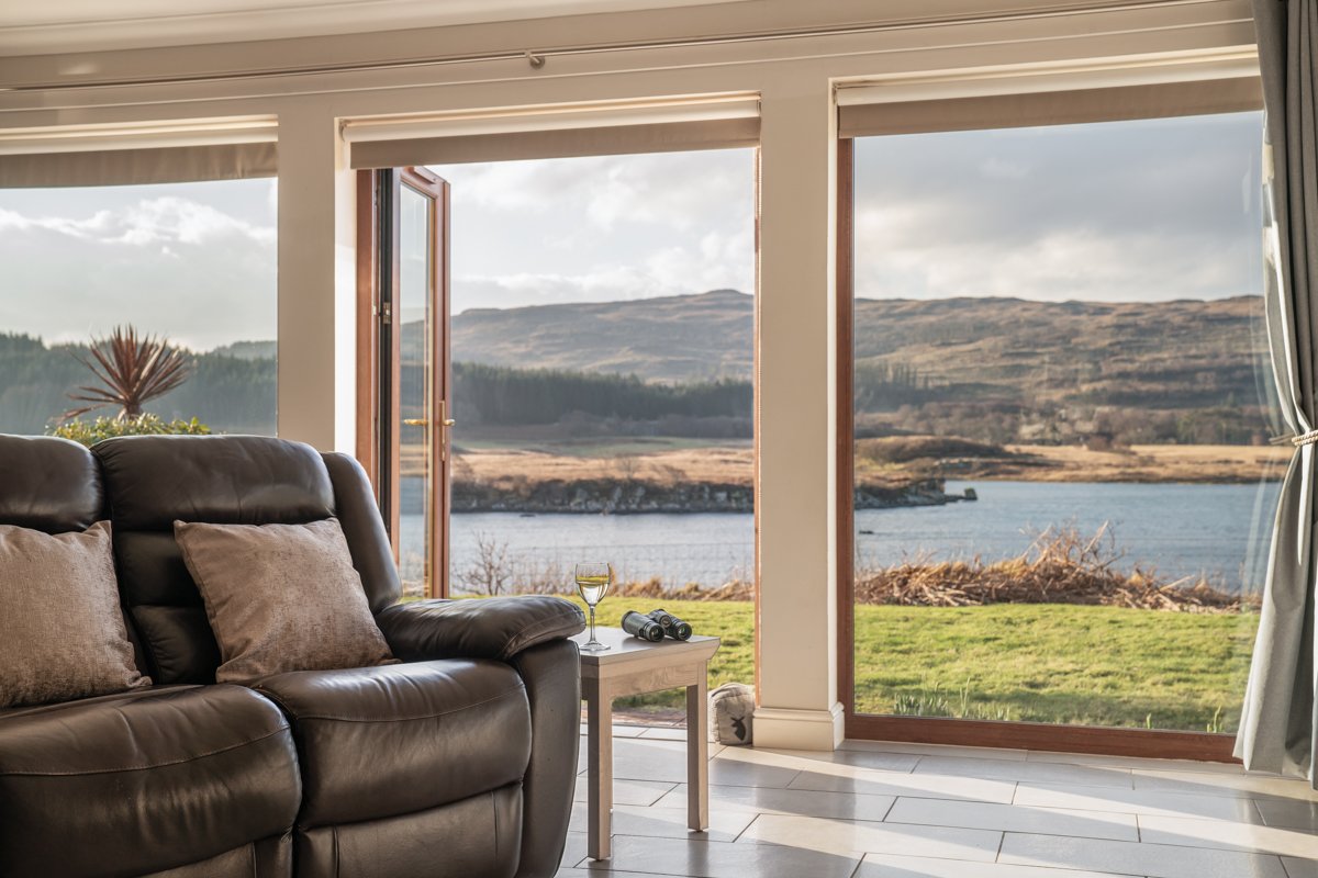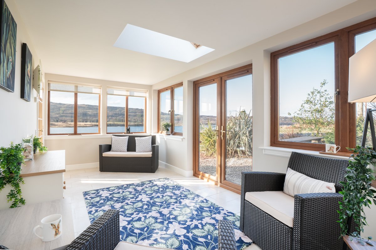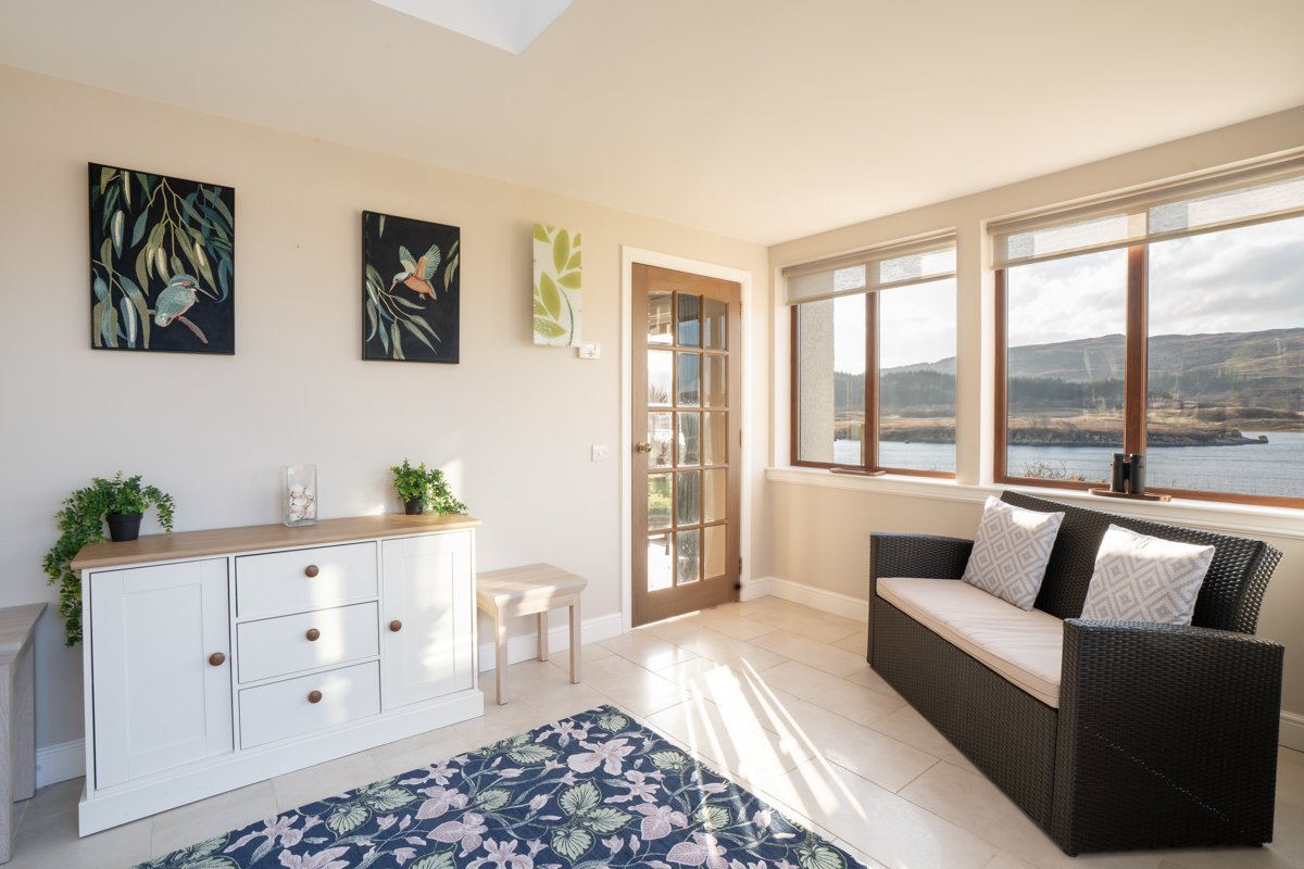 The living room leads through to the conservatory, which provides a separate sitting area with fabulous views overlooking the sea and hills beyond. Double doors open out to the patio area where there is an outside dining table and chairs. You can see some fantastic sunsets from this area of Mull and the room is perfectly orientated to be able to sit and watch the sun going down. We can’t think of many more relaxing ways to while away an evening…